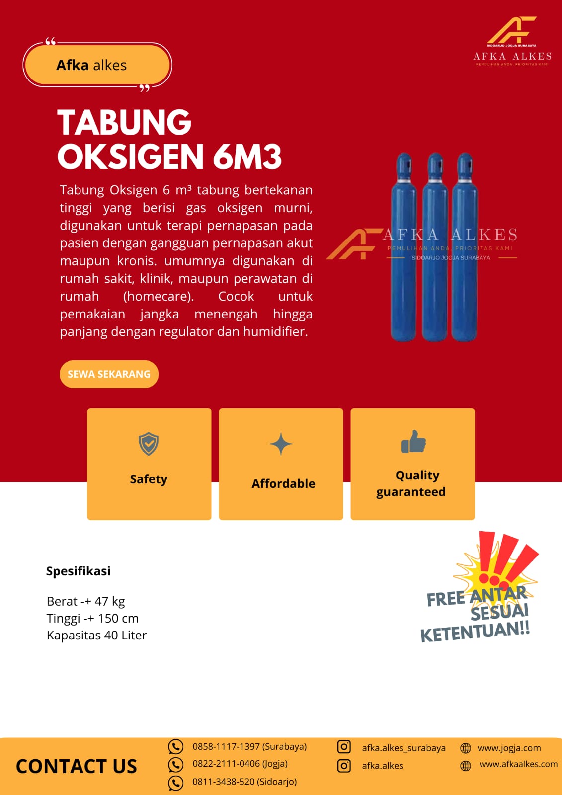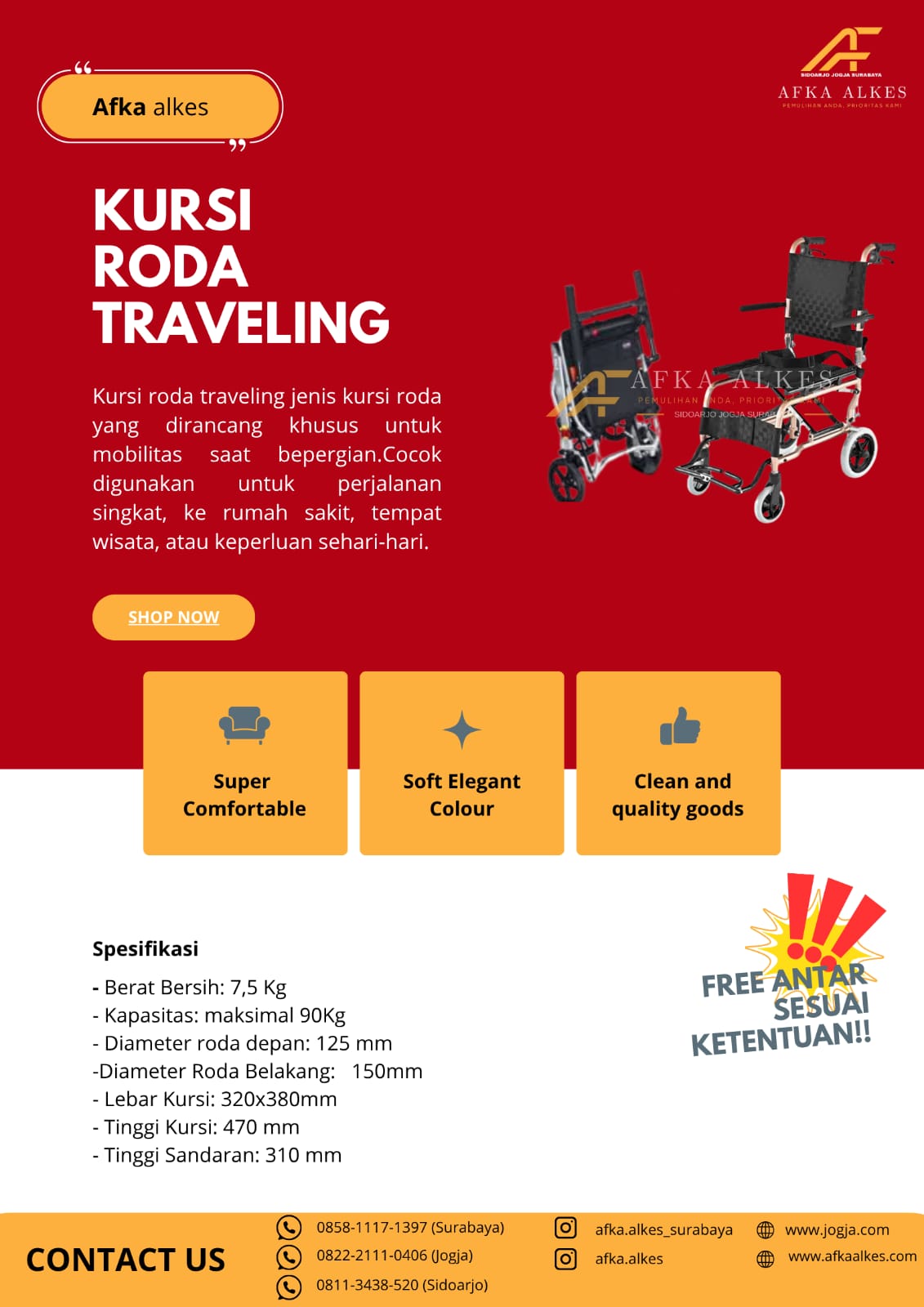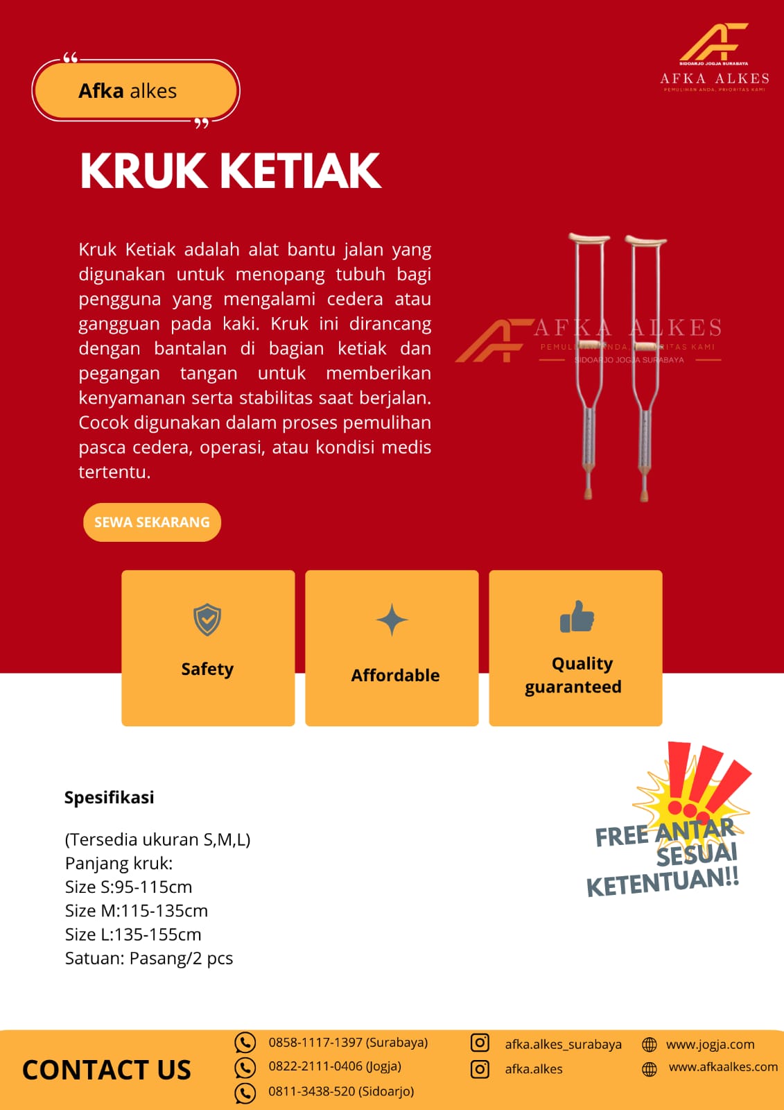 Afka Alkes adalah penyedia layanan persewaan alat kesehatan (alkes) terpercaya yang berkomitmen memberikan kemudahan bagi masyarakat dalam memenuhi kebutuhan medis. Kami hadir dengan berbagai pilihan alat kesehatan, mulai dari alat bantu jalan, alat bantu pernapasan, kursi roda, tempat tidur pasien, hingga suction pump, yang semuanya dalam kondisi bersih, terawat, dan siap pakai.