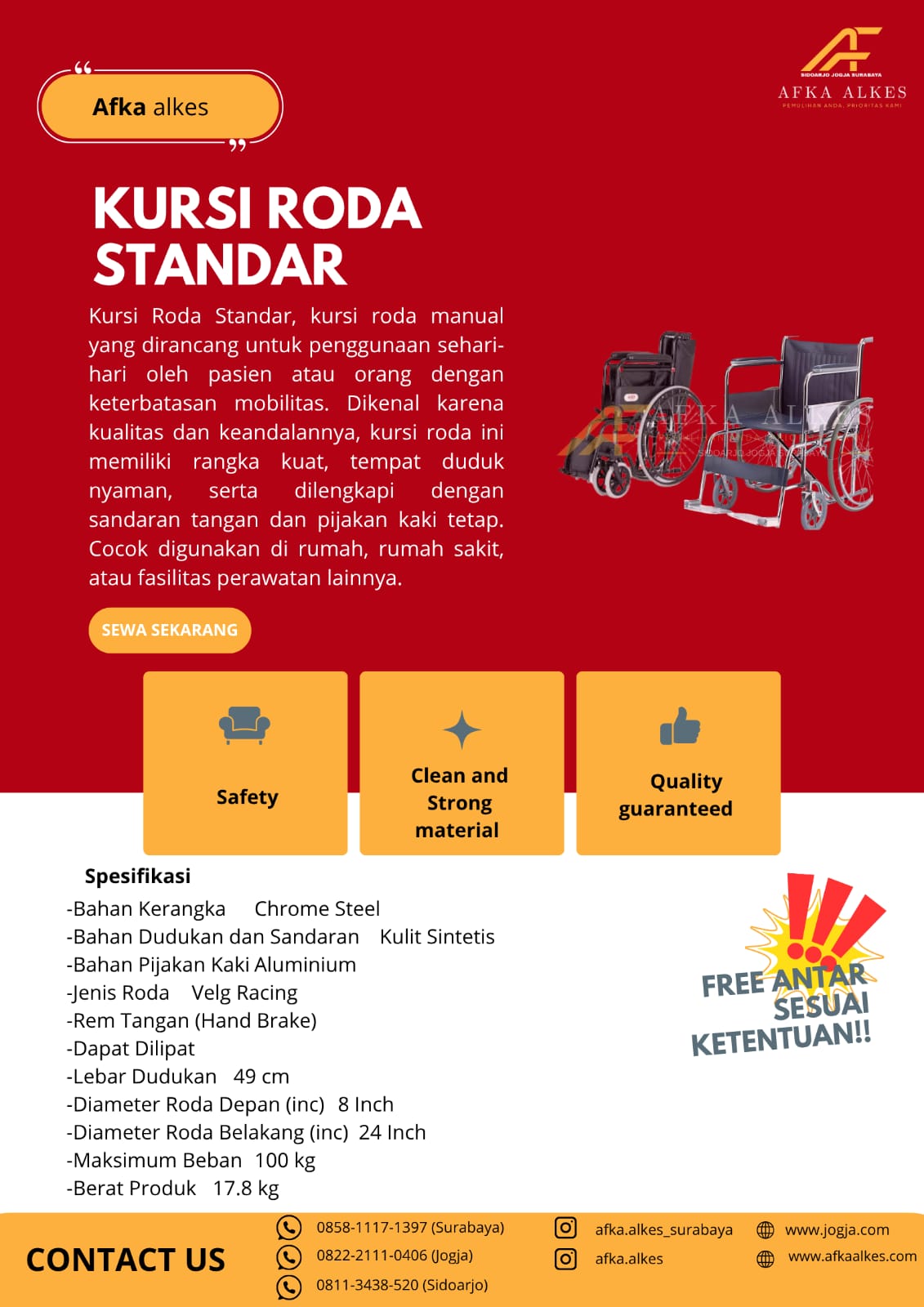 Dengan pengalaman melayani pasien, keluarga, klinik, hingga rumah sakit, Afka Alkes terus berfokus pada tiga hal utama: kenyamanan pelanggan, kebersihan alat, dan harga yang terjangkau. Setiap unit yang kami sewakan selalu melalui proses pengecekan dan sterilisasi sehingga aman digunakan.